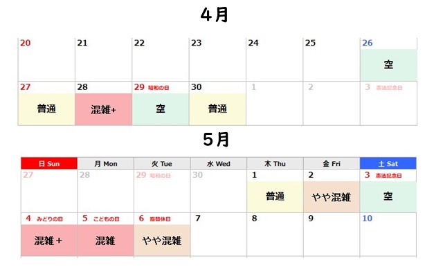 4月下旬の祝日はそこまでではないですが、5月上旬の4連休は混雑するのは間違いないでしょう。